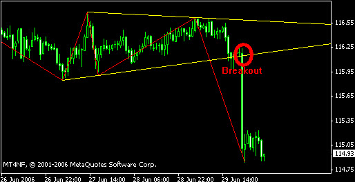 Индикатор канала очень полезный индикатор, в том плане, что он позволяет отследить уровни пробоя, а также где цена закрепилась. На графике отчетливо видно, каким образом работает индикатор. Проводятся линии по нижним зигзагам и верхним зигзагам. Полученный треугольник напоминает нам классический треугольник, применяемый нами в техническом анализе. Пробой и закрепление за которым означает тренд вниз. Собственно дальше цена это и сделала. Таким образом цель индикатора построить канал, после пробития и закрепления которого можно сказать, куда цена направляется и выставлять отложенные ордера.