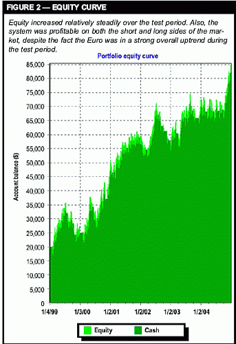 Тестовый период: Январь 1999 – январь 2005. Начальный депозит: 20.000 долларов. Комиссия 20 долларов на контракт. Проскальзывание 2 тика для каждого стопа или рыночного ордера. Управление капиталом: 1 контракт на сигнал. Итоги тестирования: Система похожа на другие системы следования тренду тем, что сделки по ней достаточно редки. За шесть лет была совершена 31 сделка. Средний период пребывания в сделке составил 37 свечей. Кривая депозита, показанная на рисунке 2, демонстрирует устойчивую тенденцию к росту.